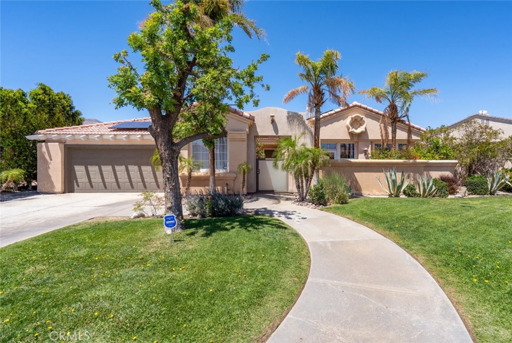 Sprawled across a desert cul-de-sac in beautiful Palm Springs is a gorgeous resort style home! A large driveway & neat greenery frame around the large front porch upon entry. Awashed with bright light, the high ceilings of the open floorplan encapsulating the dining room, two living rooms, & kitchen enjoy a wonderful airy atmosphere. Lovely destressed styled laminate floors enhance mixed with stone tile floors flow throughout. Both living rooms share a half wall fitted with a corner stone fireplace that faces the dining room. The open kitchen sparkles from the large windows & recessed lights that accentuate a large kitchen island with ample bar stool seating room, stone gray built-in cabinets, all stainless-steel appliances, & the glossiest of granite countertops. The bedrooms are unique: one with home office potential includes tile floors & a private patio while another has laminate floors & a built-in office nook. One of the large main bedrooms houses an attached bathroom & personal access out to the backyard. The primary bedroom delights in its large private patio and en-suite bathroom featuring a dual sink vanity, glass shower stall, & a relaxing soaking tub. Venture outside & be welcome to paradise! This exclusive oasis includes a shaded dining/patio space, a sunbathing lounge beneath a pergola, a fabulous BBQ kitchen with outdoor breakfast bar, an expansive grassy lawn, & a sparkling pool! Minutes from local restaurants, shops, schools, access to the 10-highway, & more!